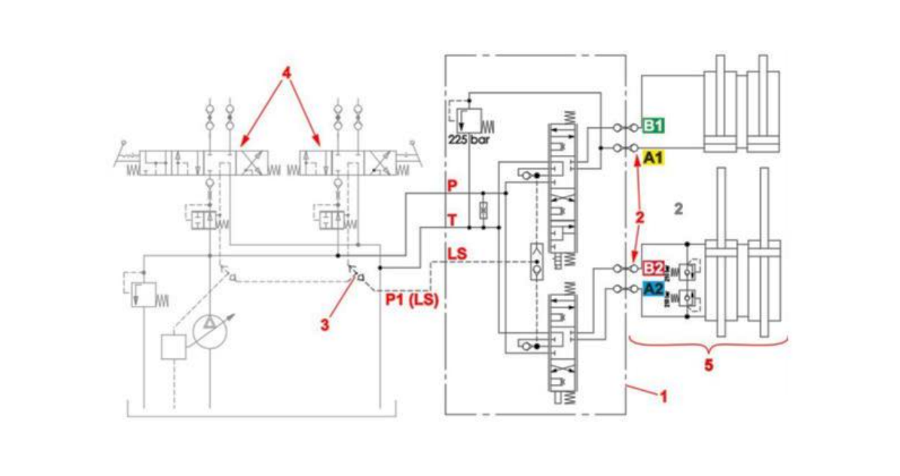 Lo schema mostra un sistema idraulico LOAD SENSING: